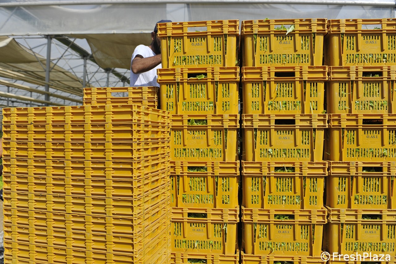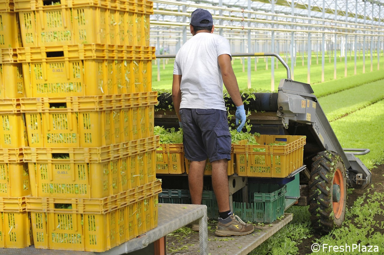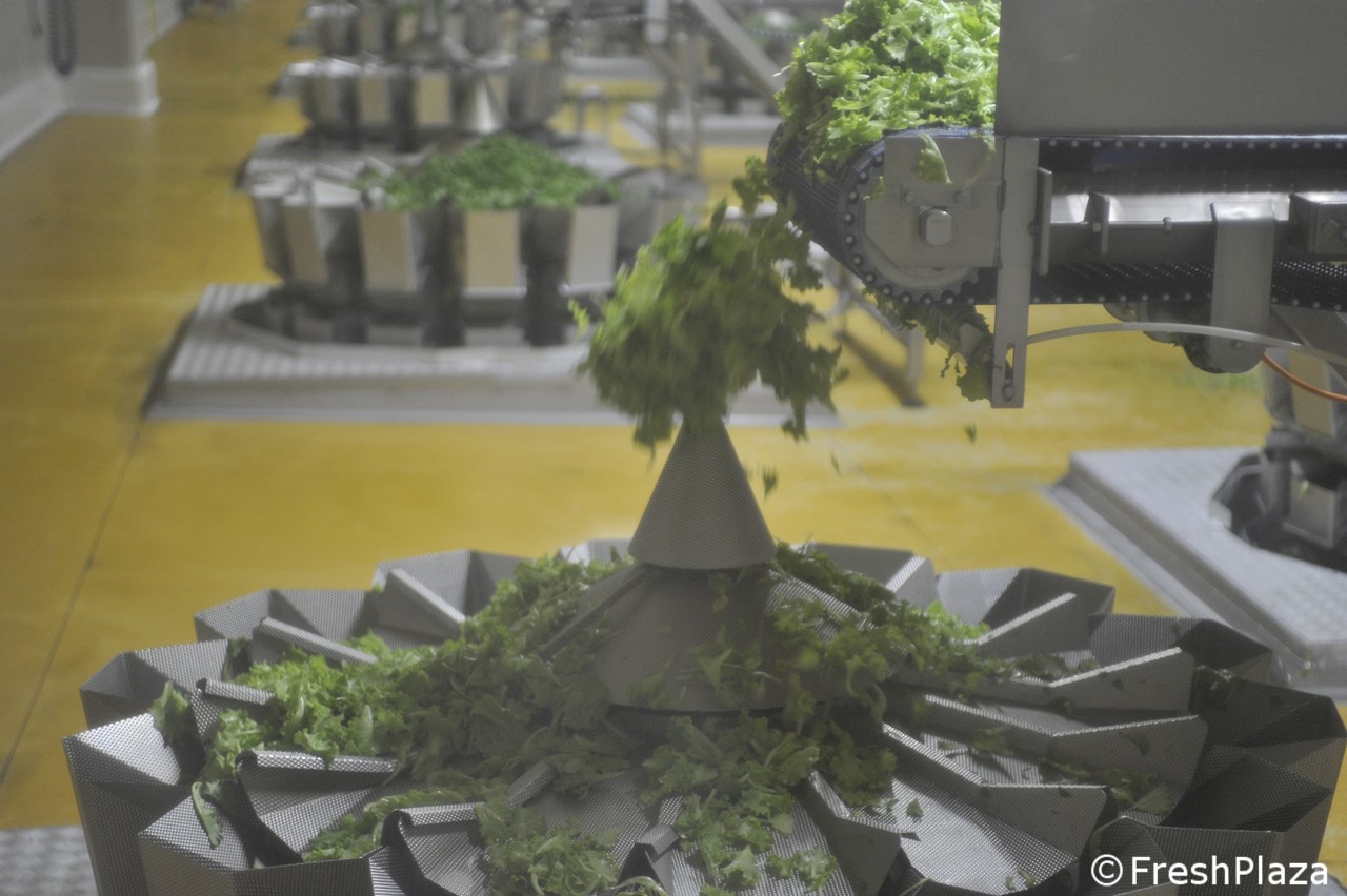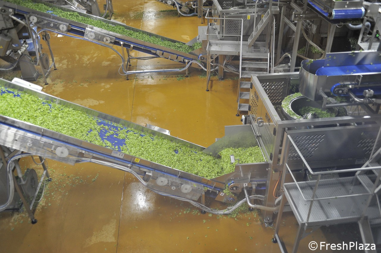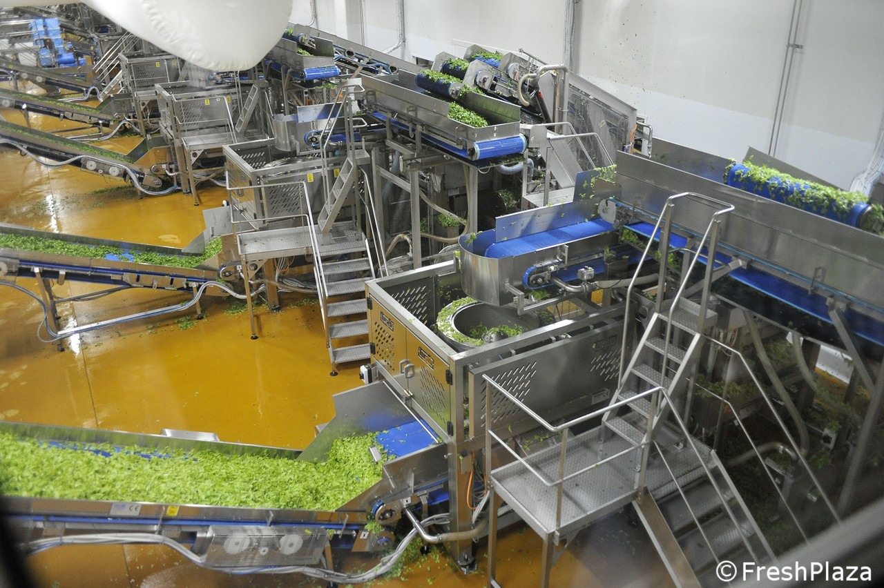 Le casse di verdura pronta per la quarta gamma vengono impilate sulle pedane