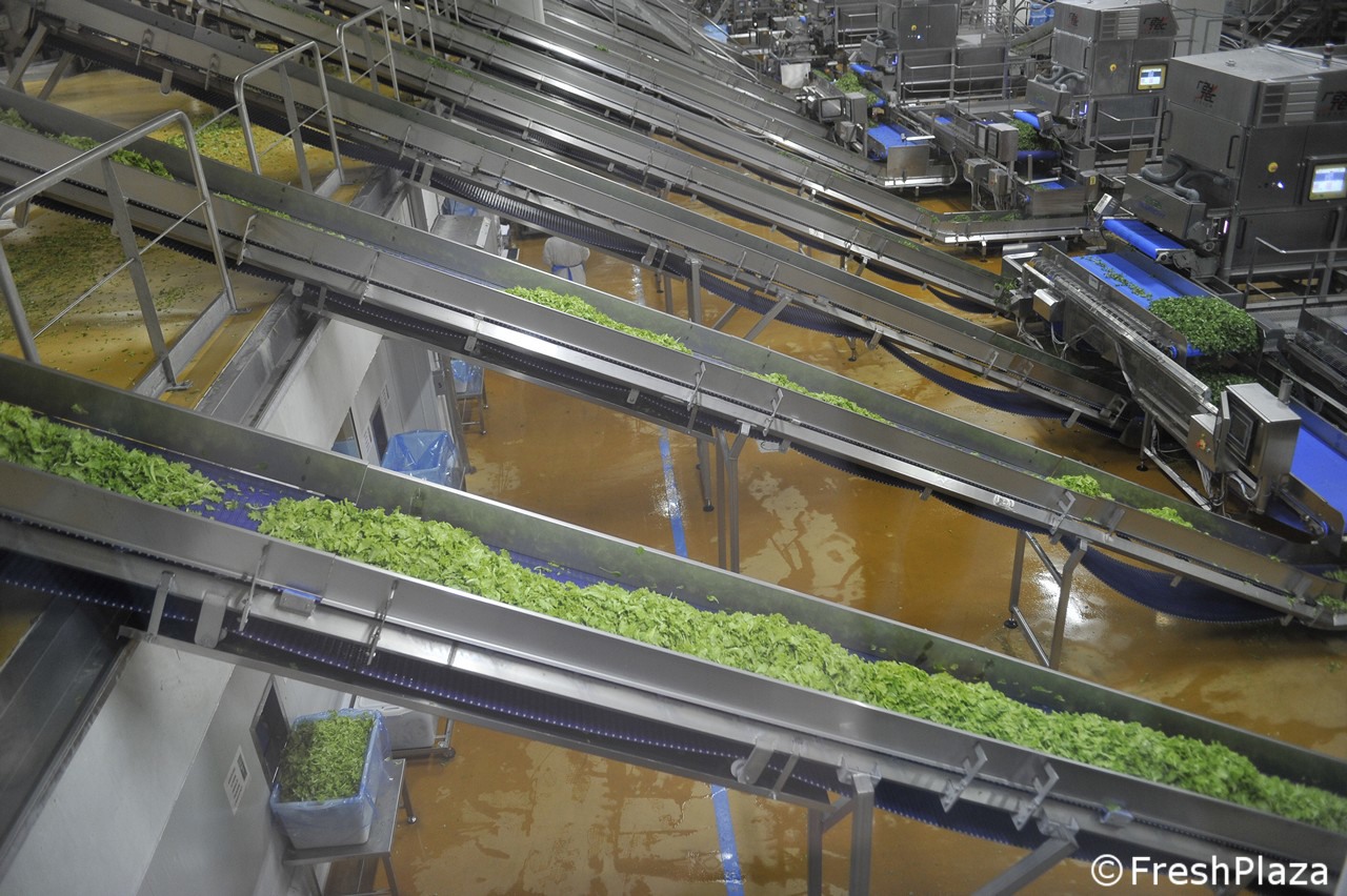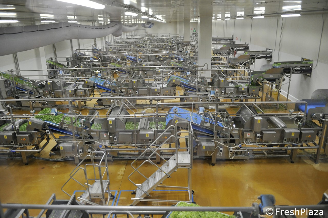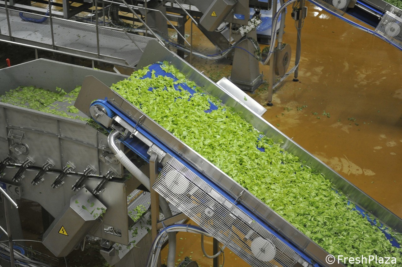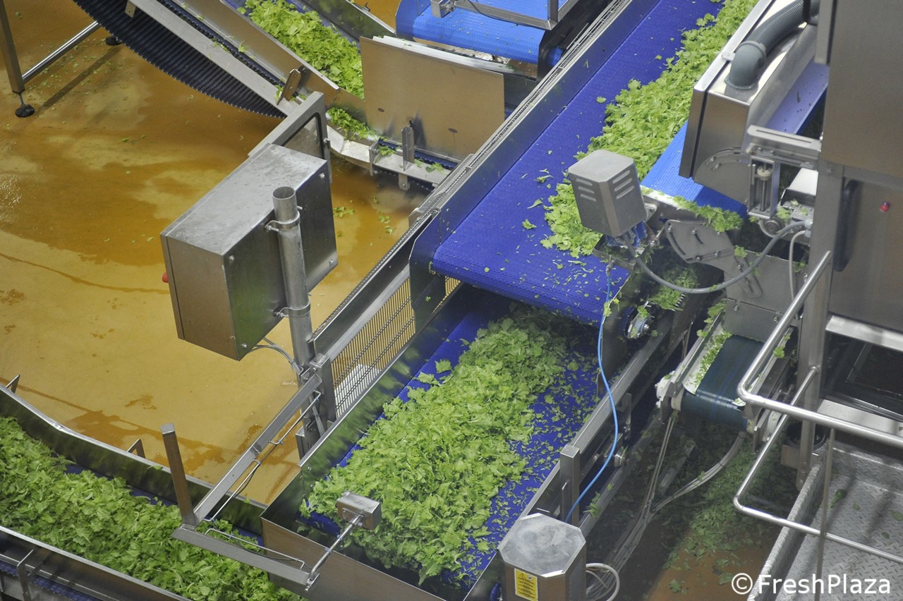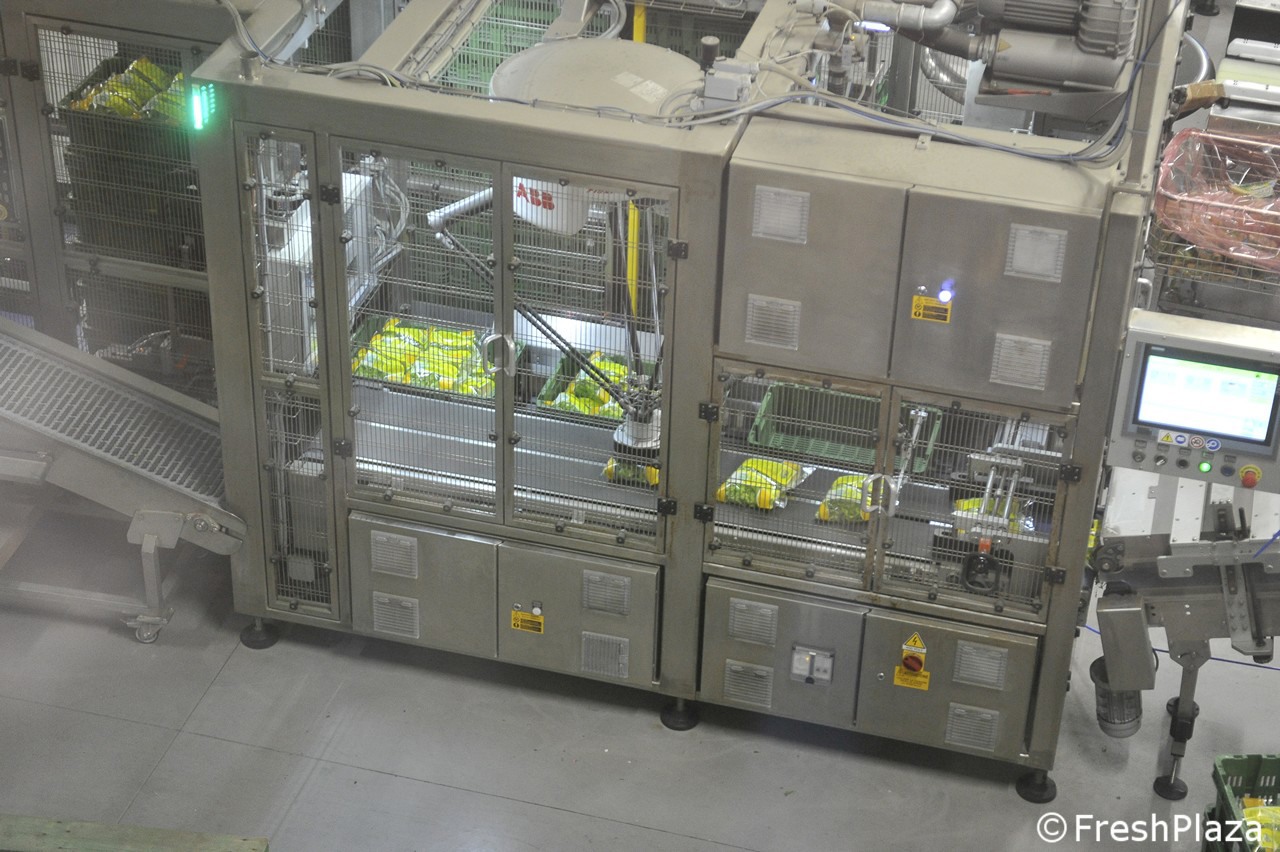 Le casse di verdura pronta per la quarta gamma vengono impilate sulle pedane