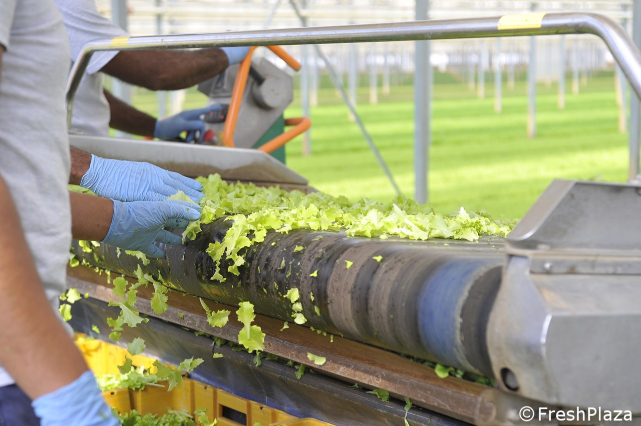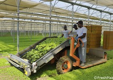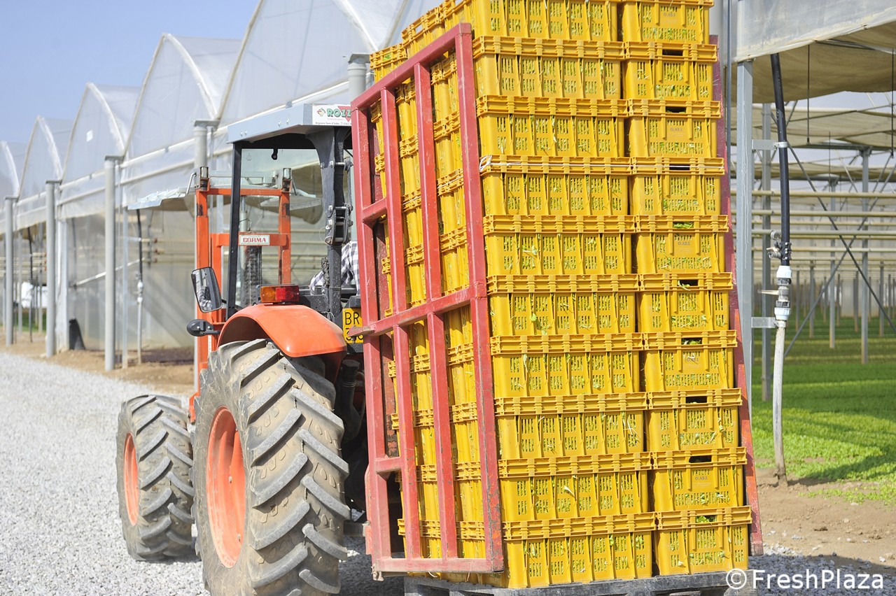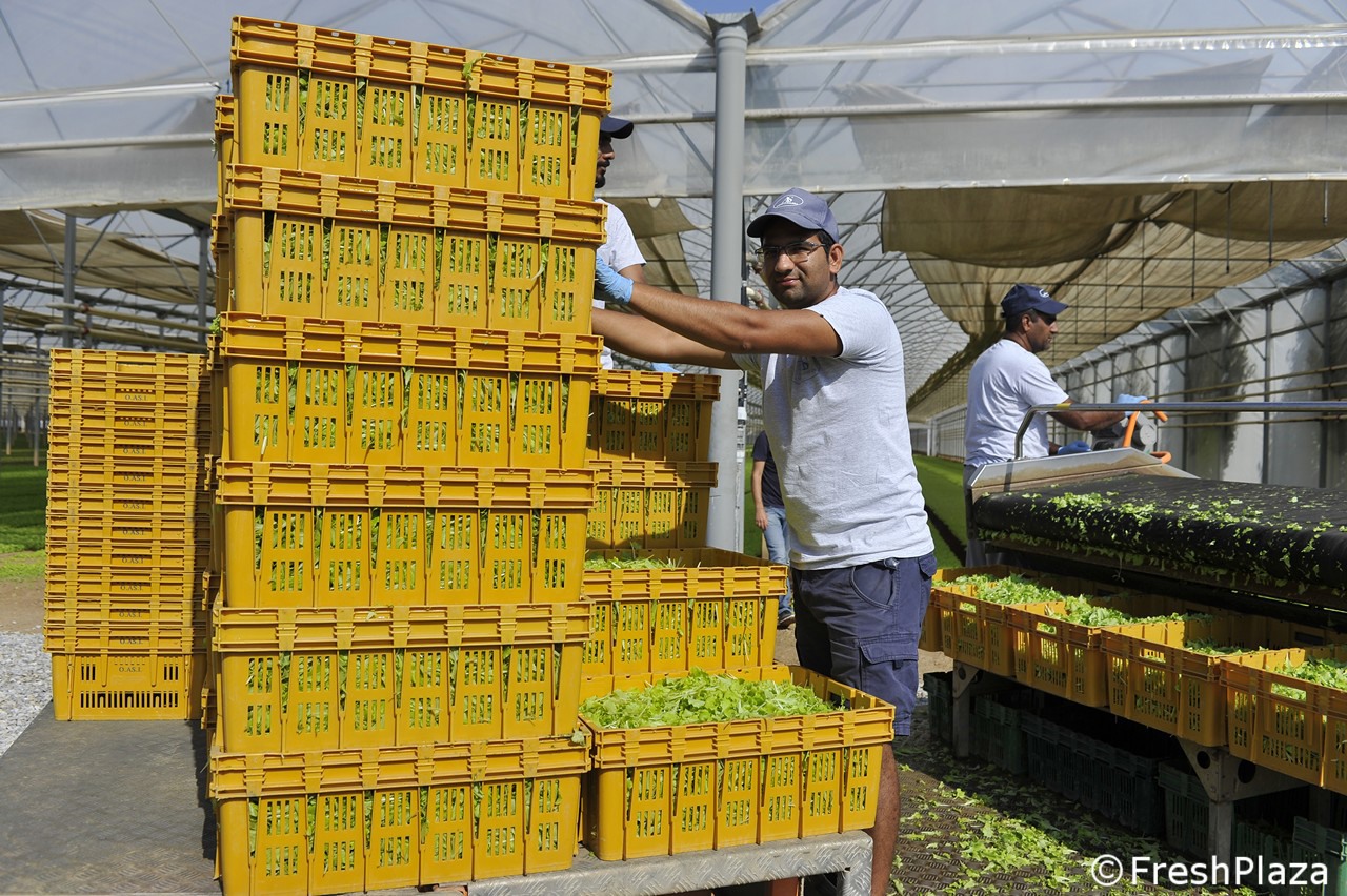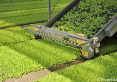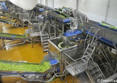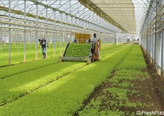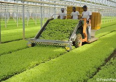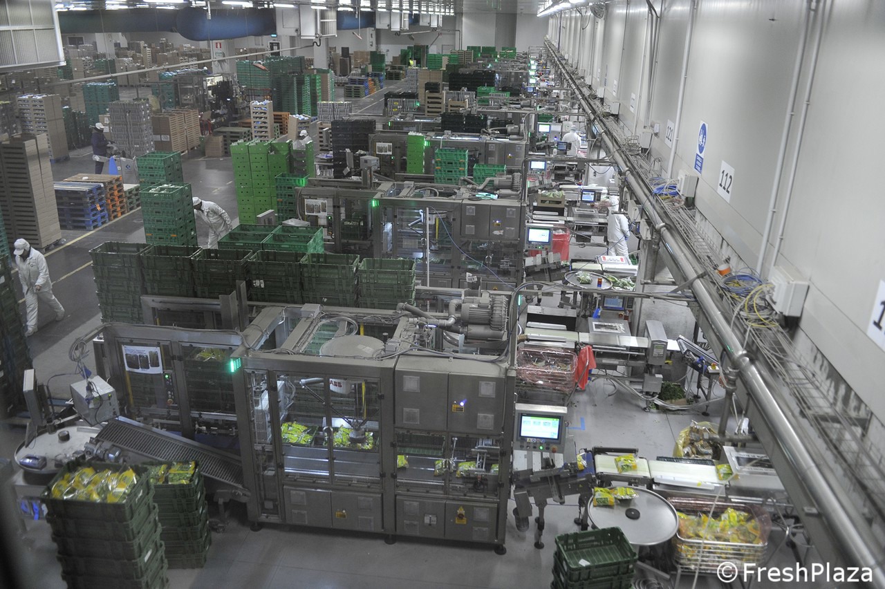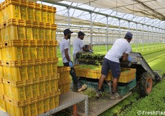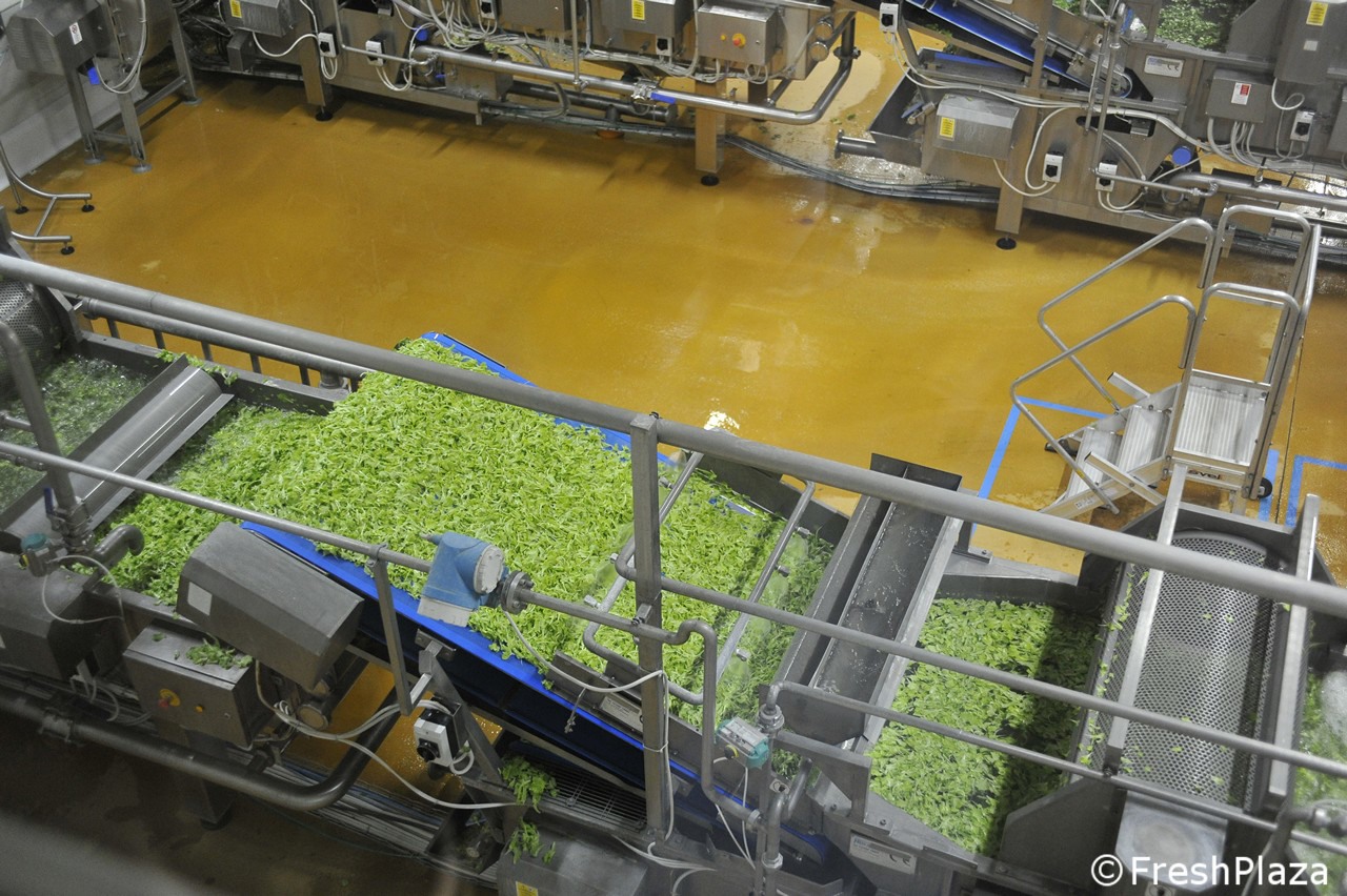 Le casse di verdura pronta per la quarta gamma vengono impilate sulle pedane