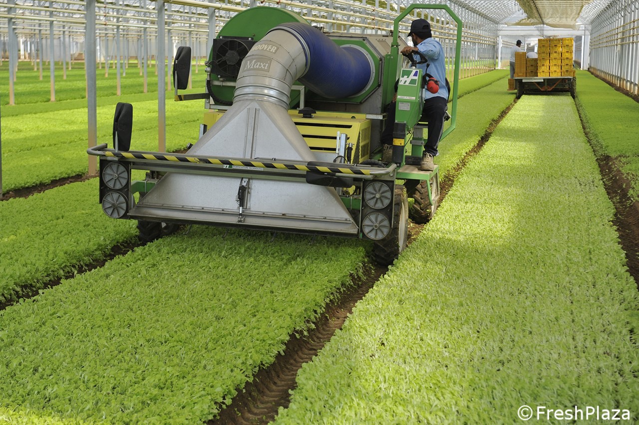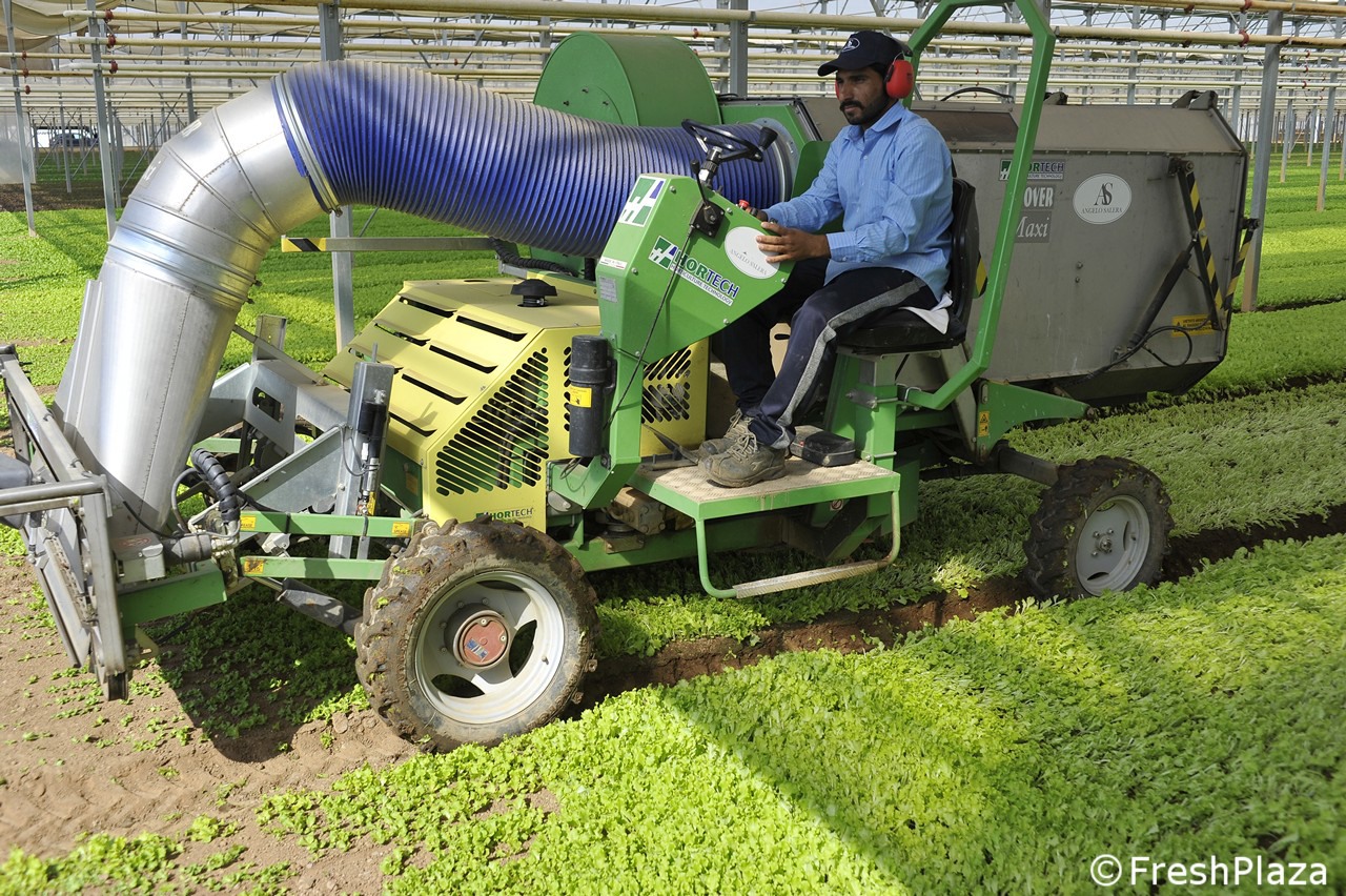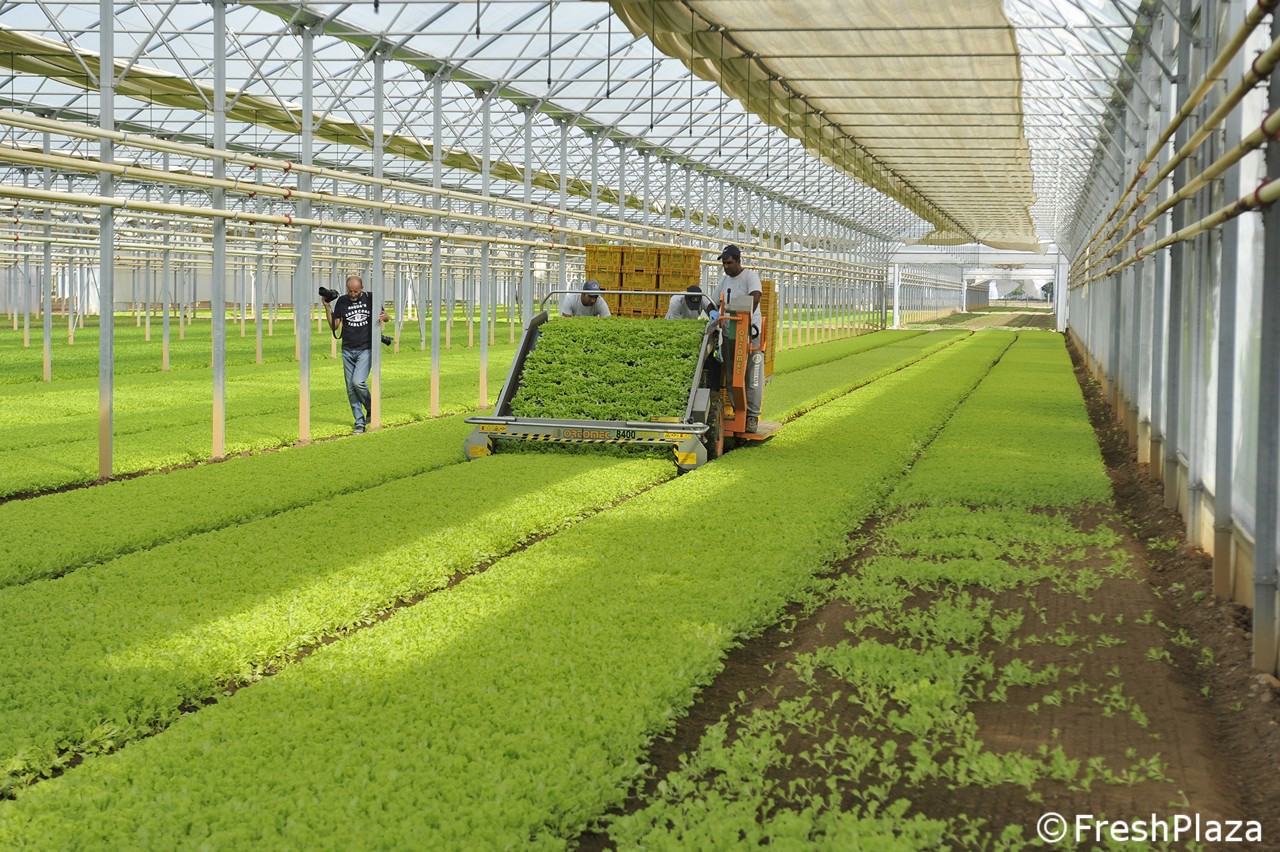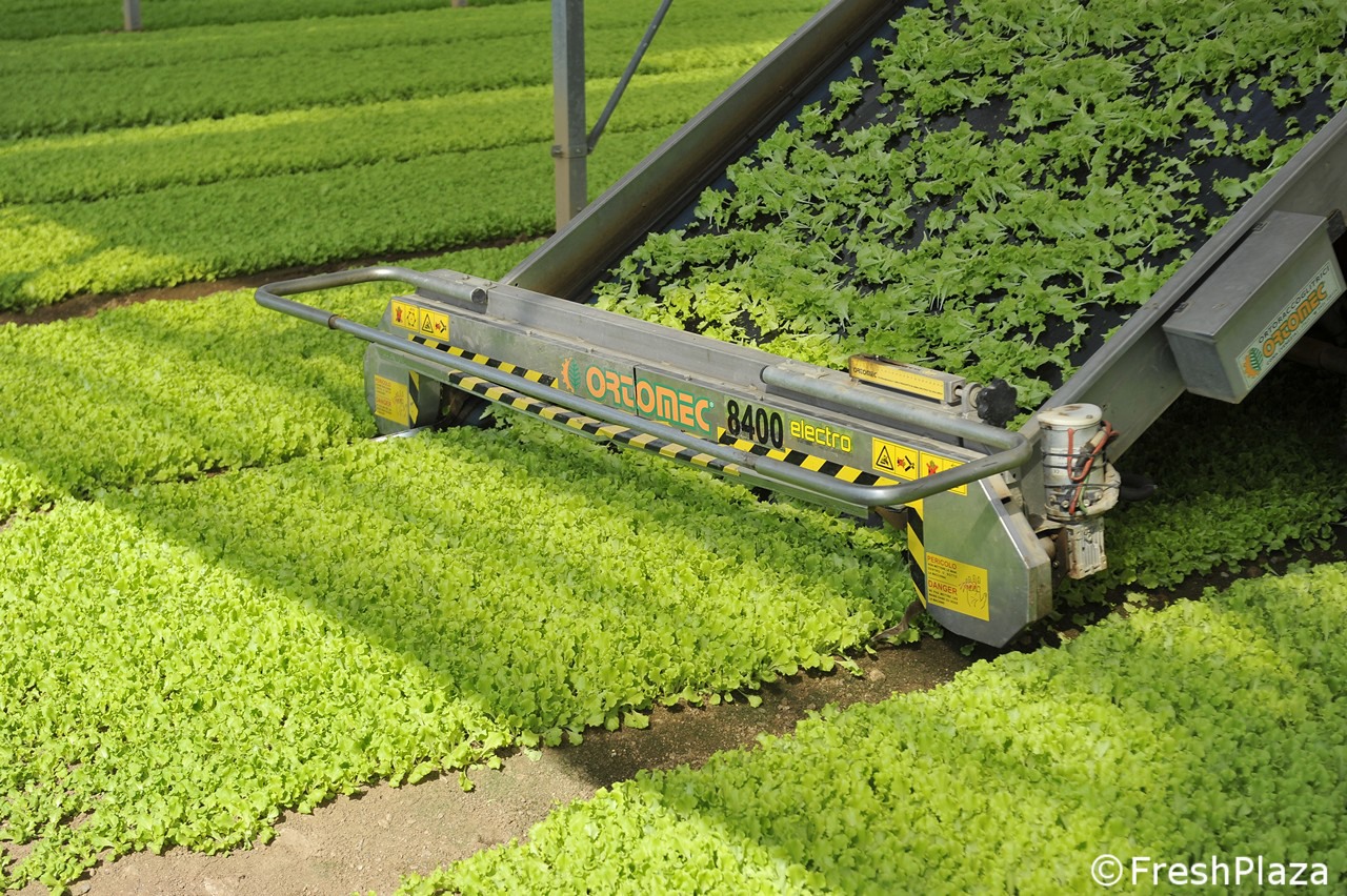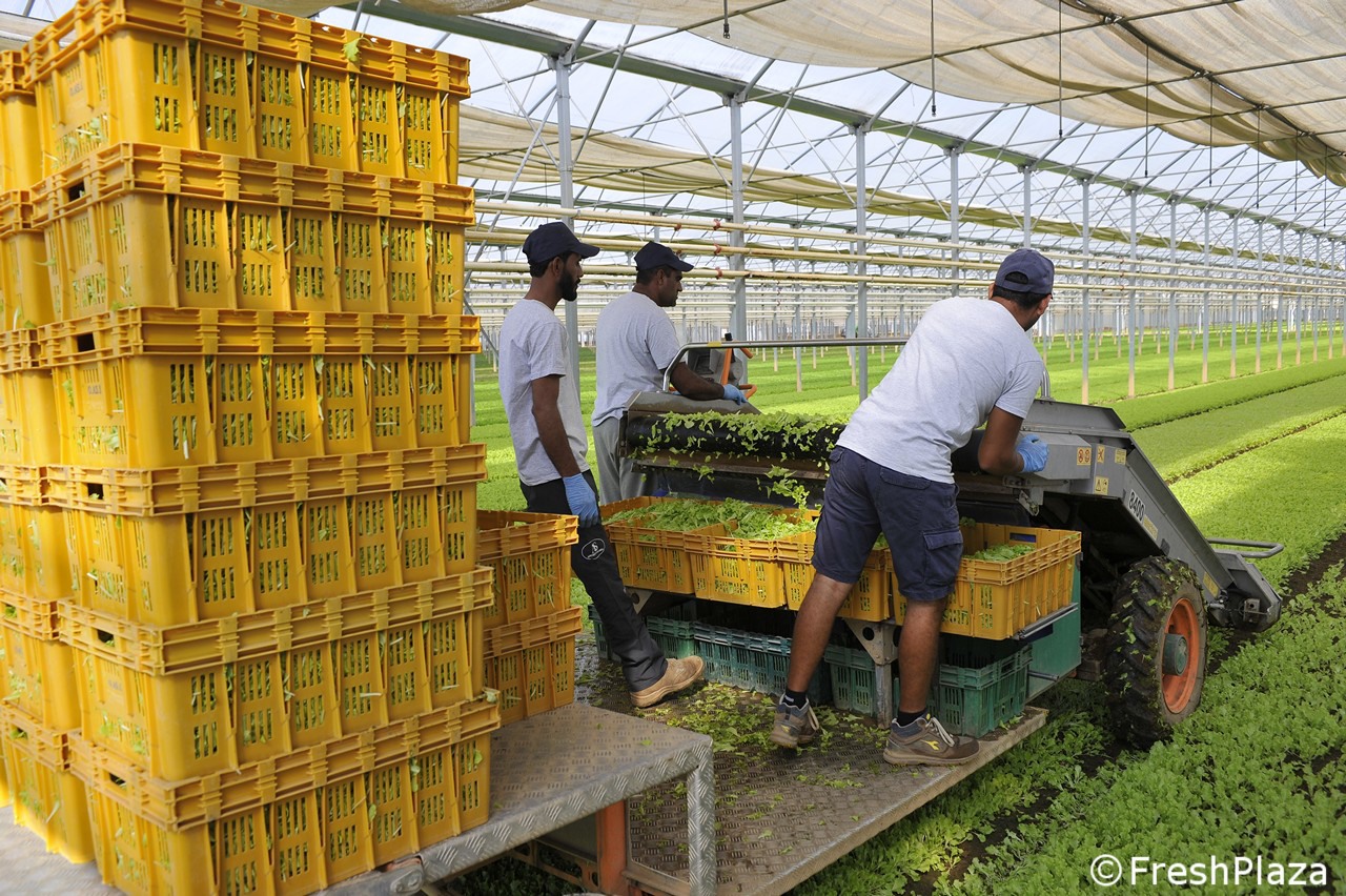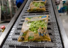 Le casse di verdura pronta per la quarta gamma vengono impilate sulle pedane