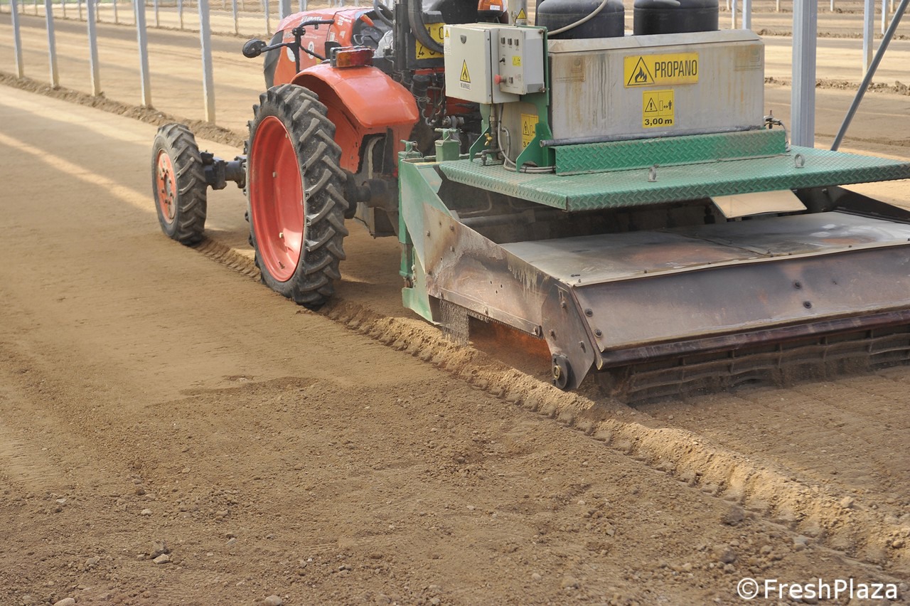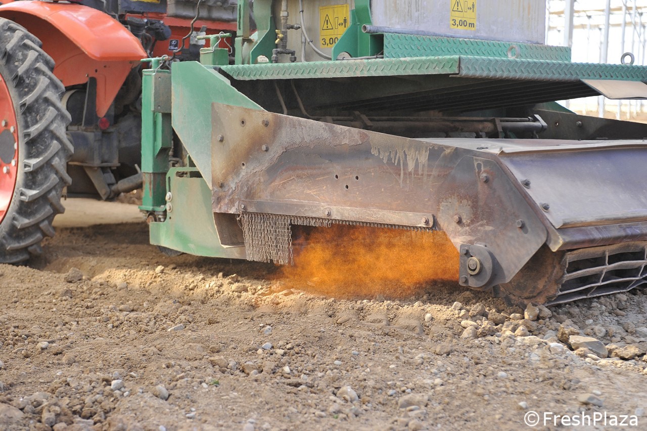 Particolare delle fiamme del pirodiserbo, che provoca la disattivazione dei patogeni e infestanti grazie a una temperatura di circa 500 °C