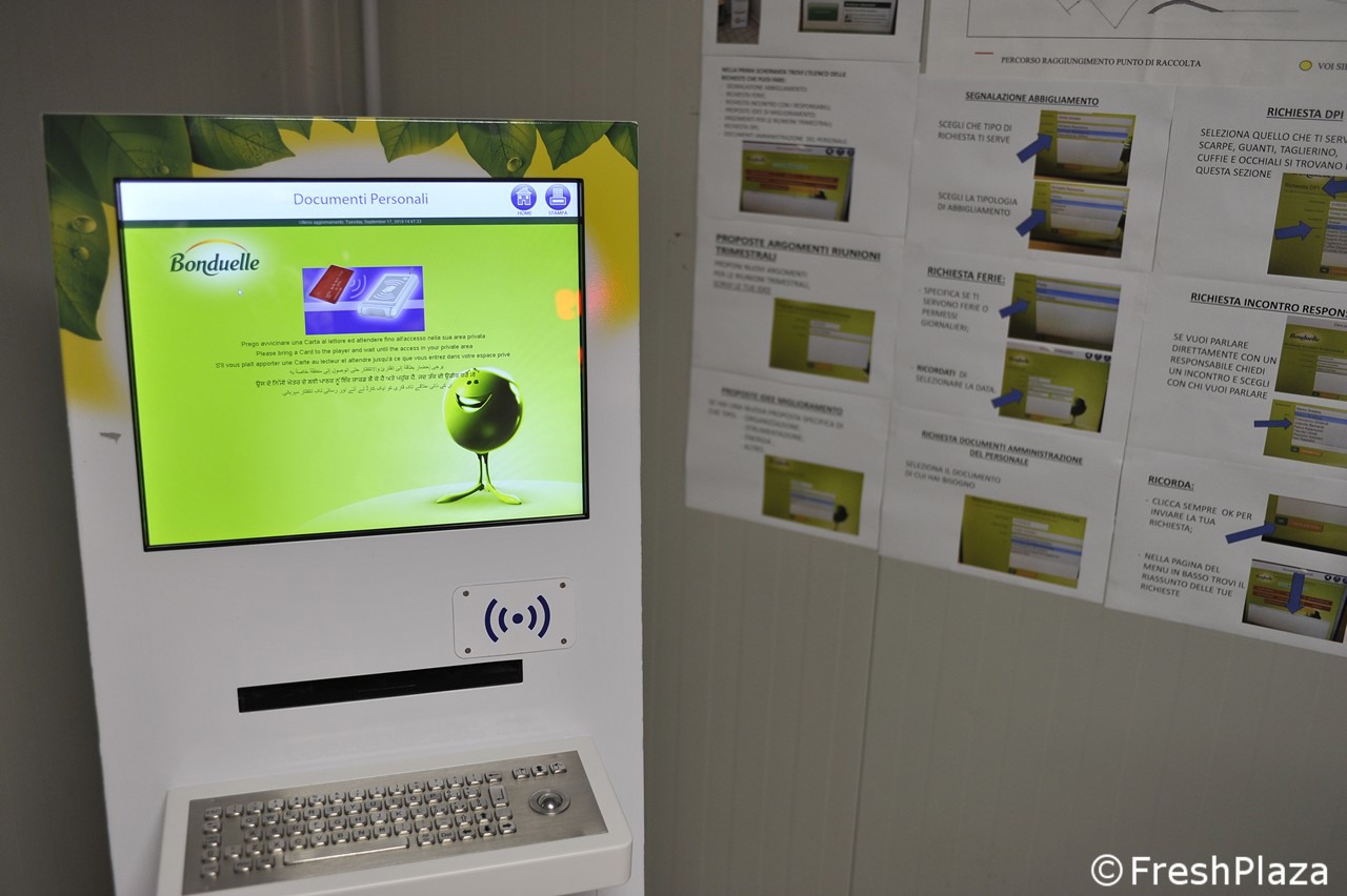 La lattuga, o le altre tipologie, raccolta in azienda, in meno di due ore dal taglio arriva in stabilimento Bonduelle che dista 15 km dall'azienda. Qui in foto il totem che i dipendenti hanno per ogni comunicazione aziendale