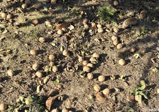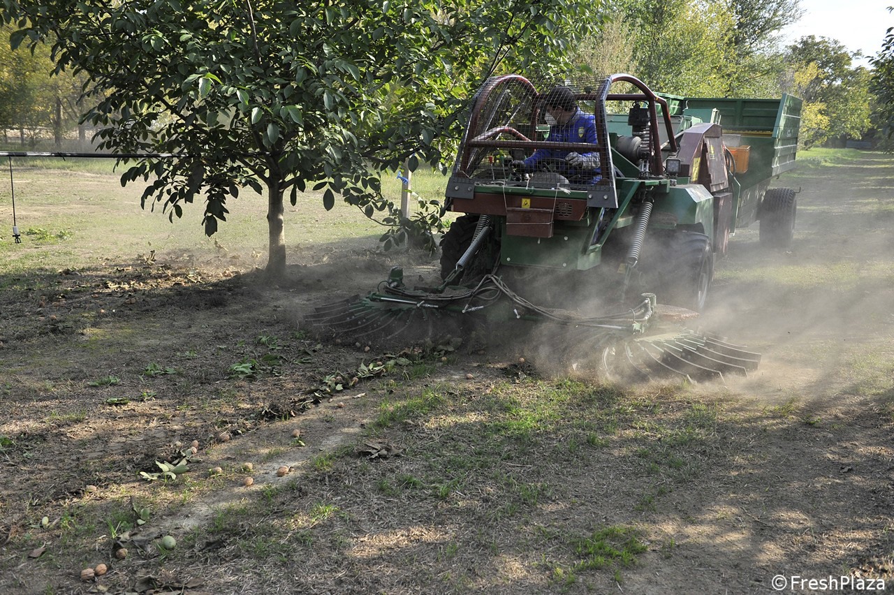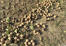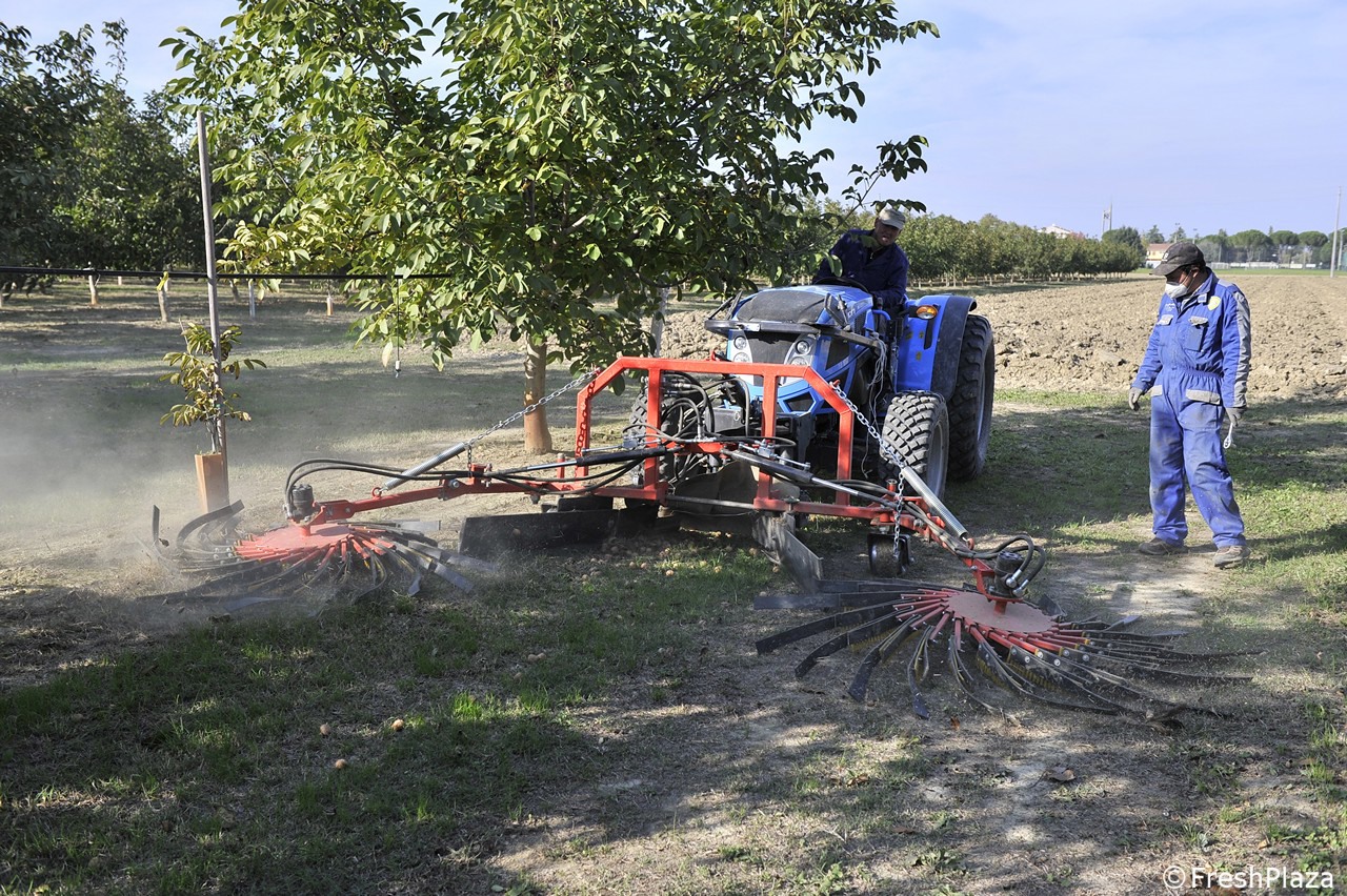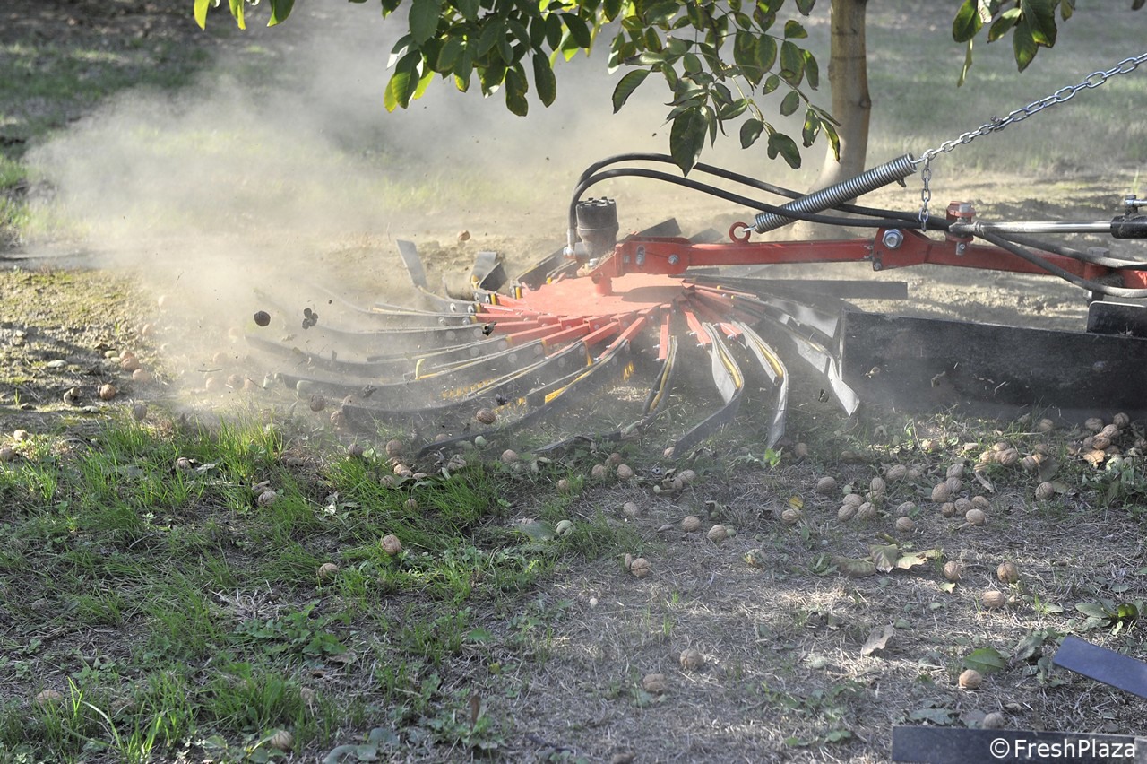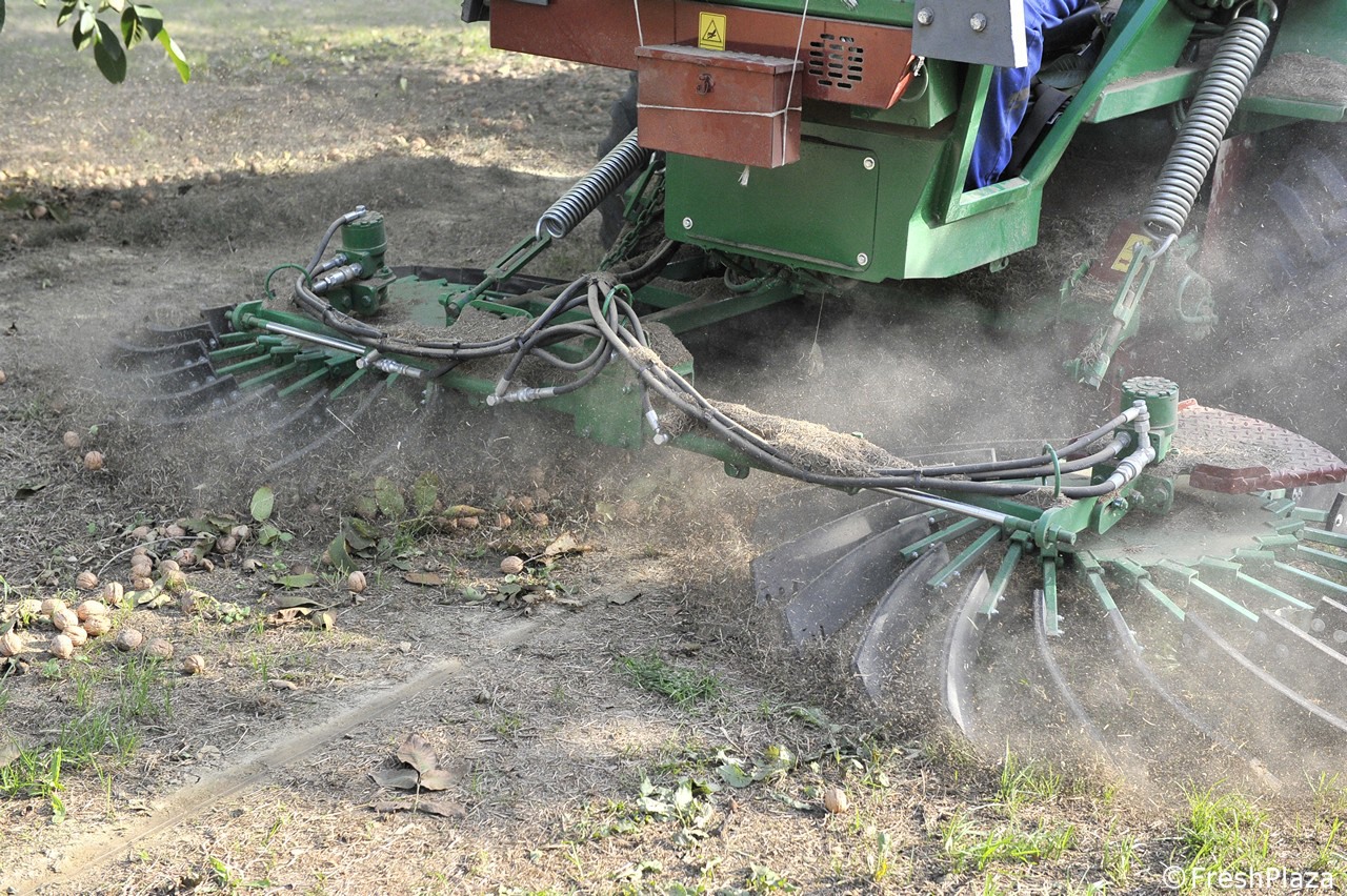 Noci pronte per essere aspirate dalla macchina raccoglitrice