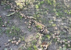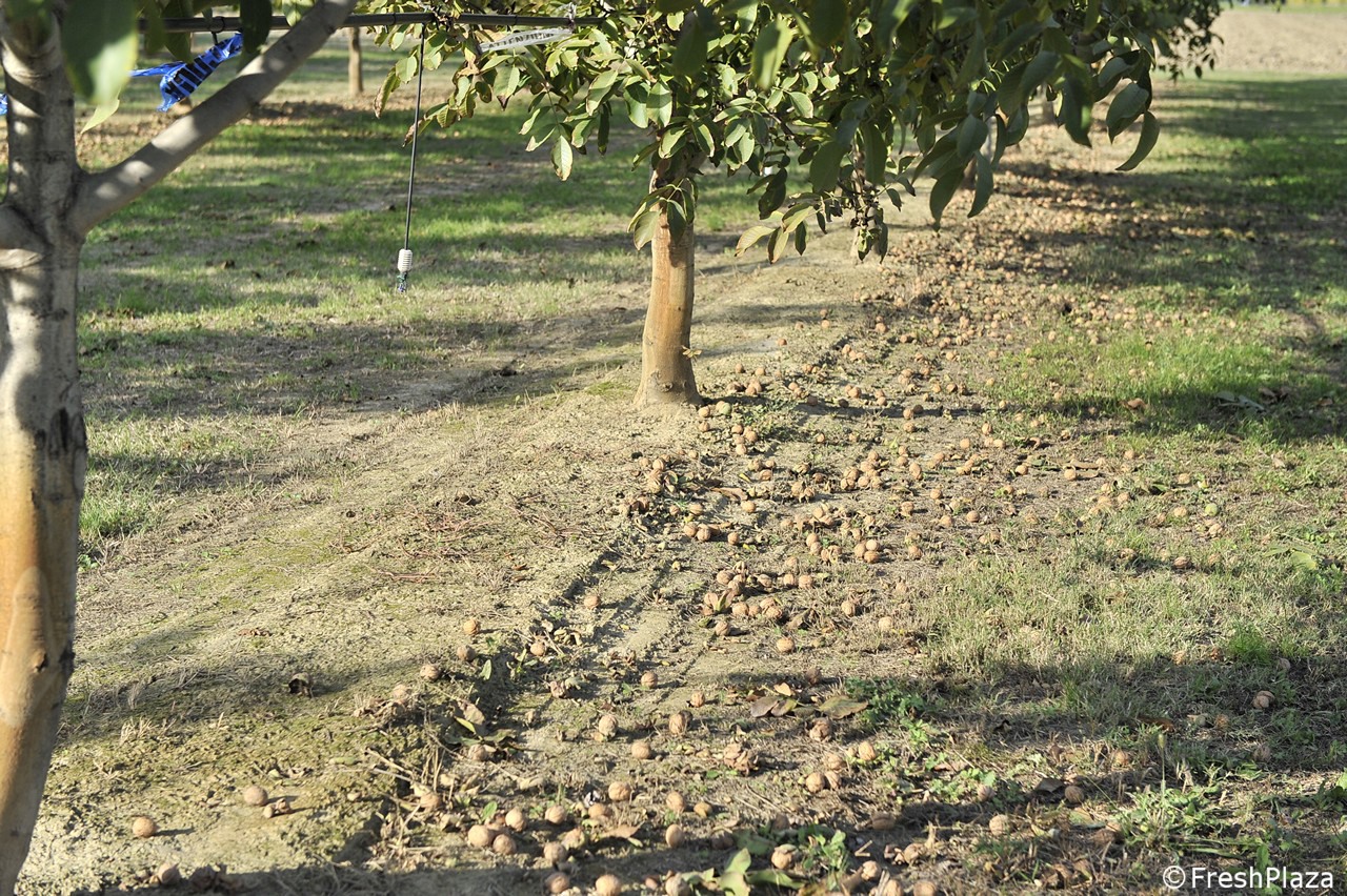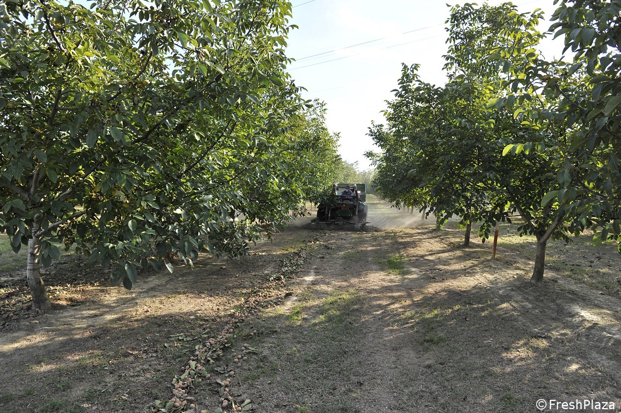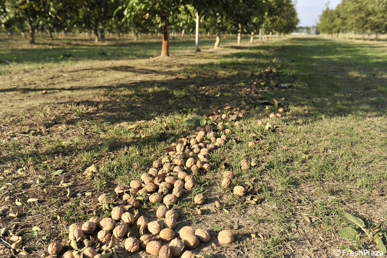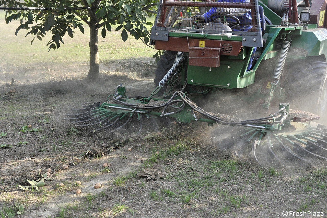Noci pronte per essere aspirate dalla macchina raccoglitrice