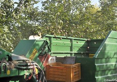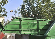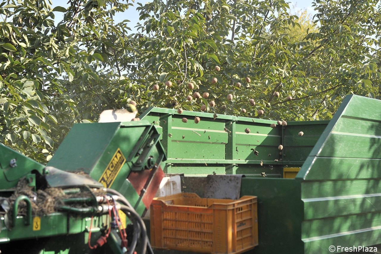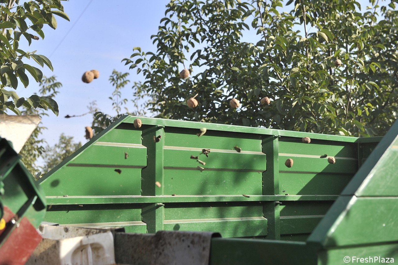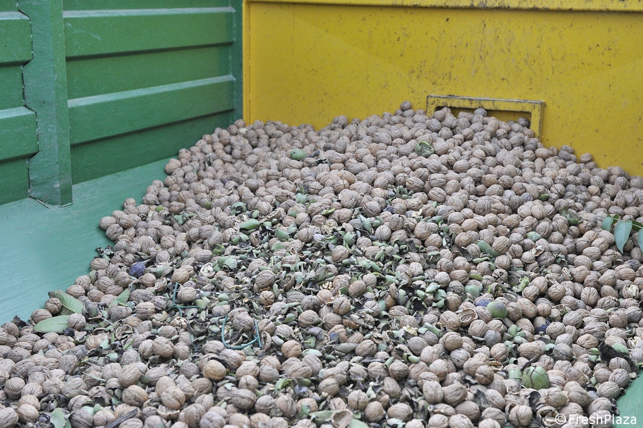 A fine carico le noci vengono trasferite dalla tramoggia ai camion per la consegna nello stabilimento di essiccazione