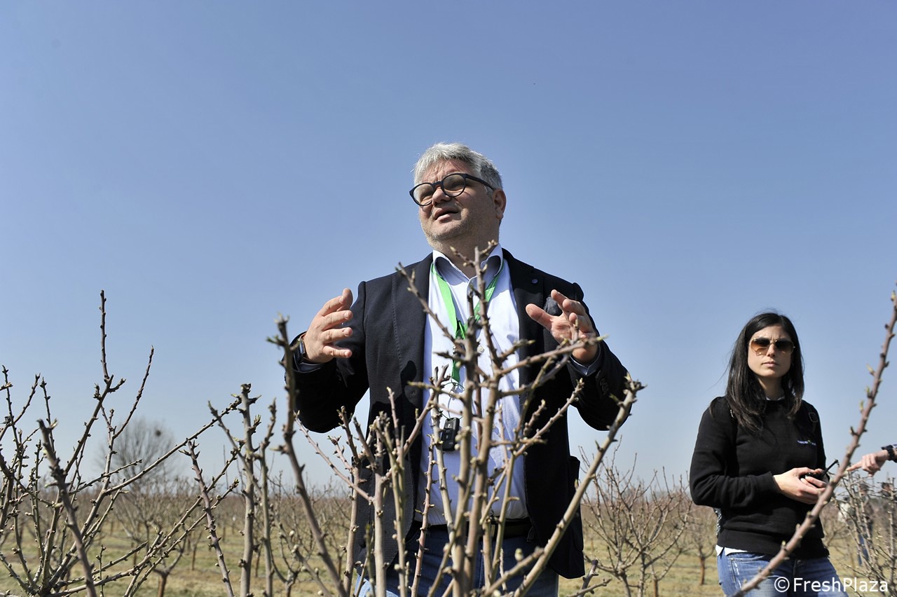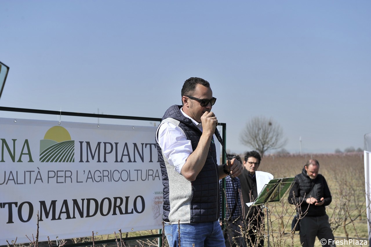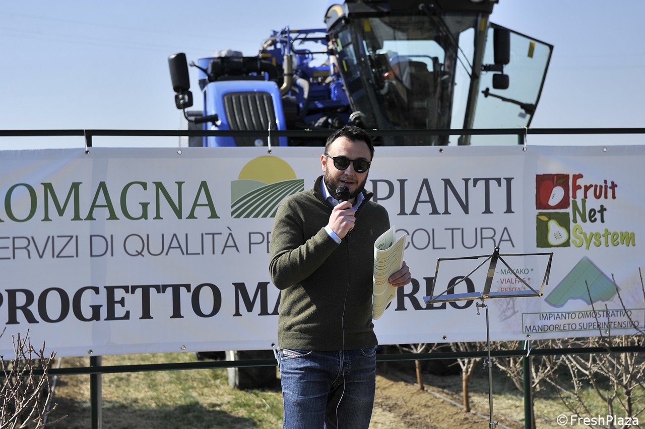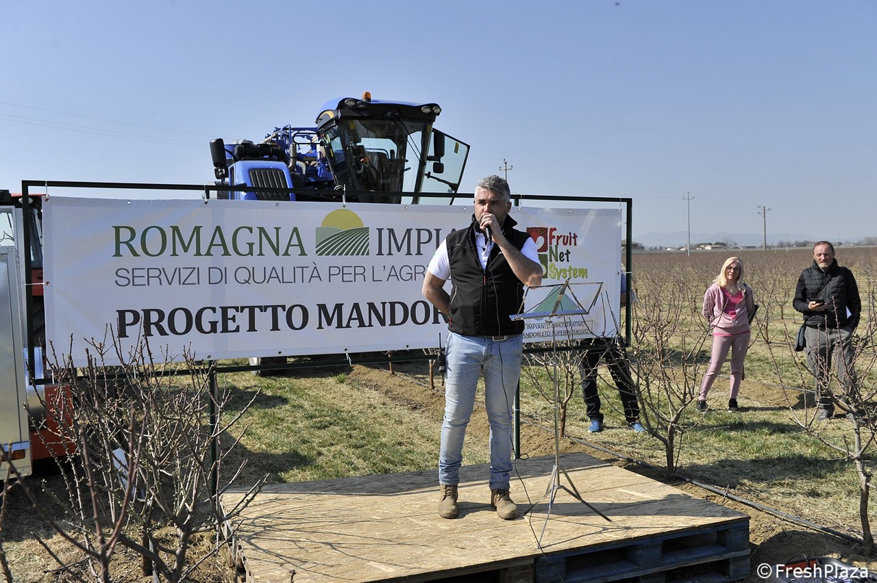 Matteo Ferrari mentre descrive le caratteristiche dell'impianto, 3 ettari di mandorleto intensivo