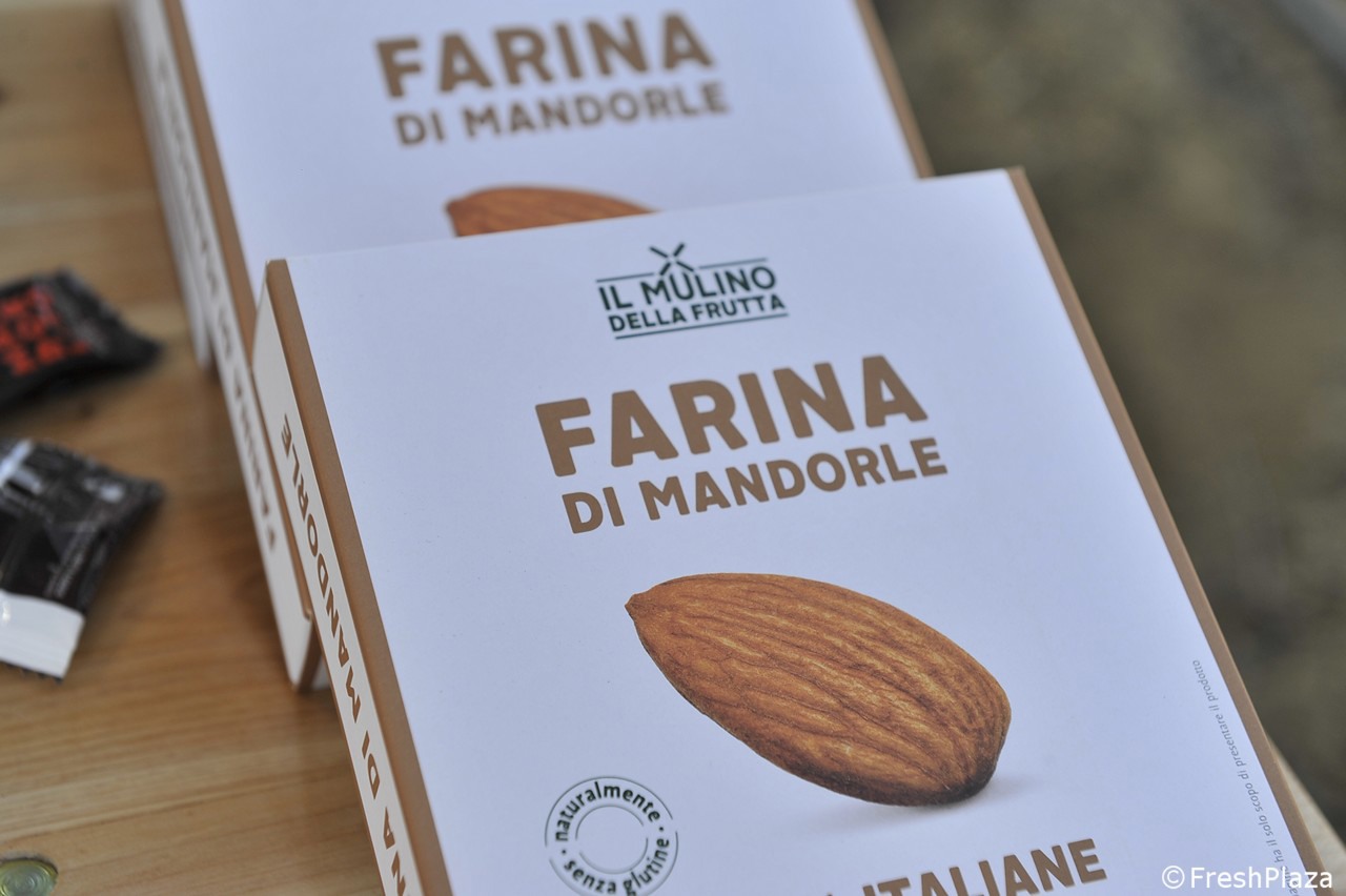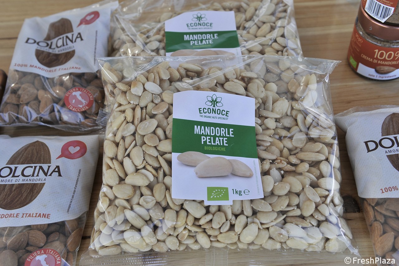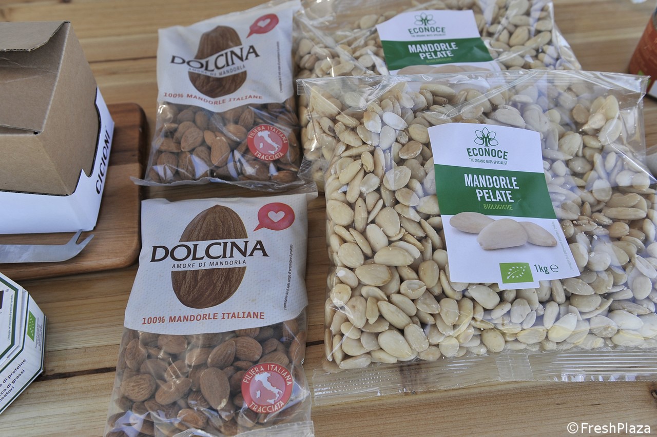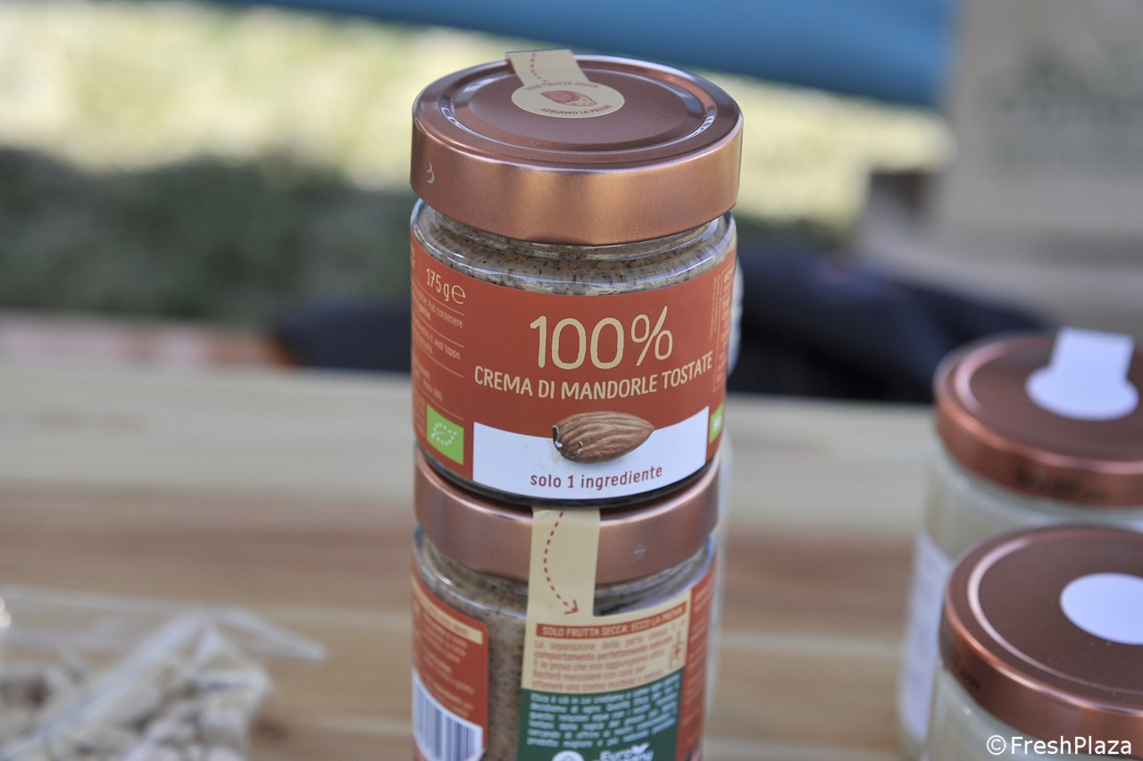 Matteo Ferrari mentre descrive le caratteristiche dell'impianto, 3 ettari di mandorleto intensivo